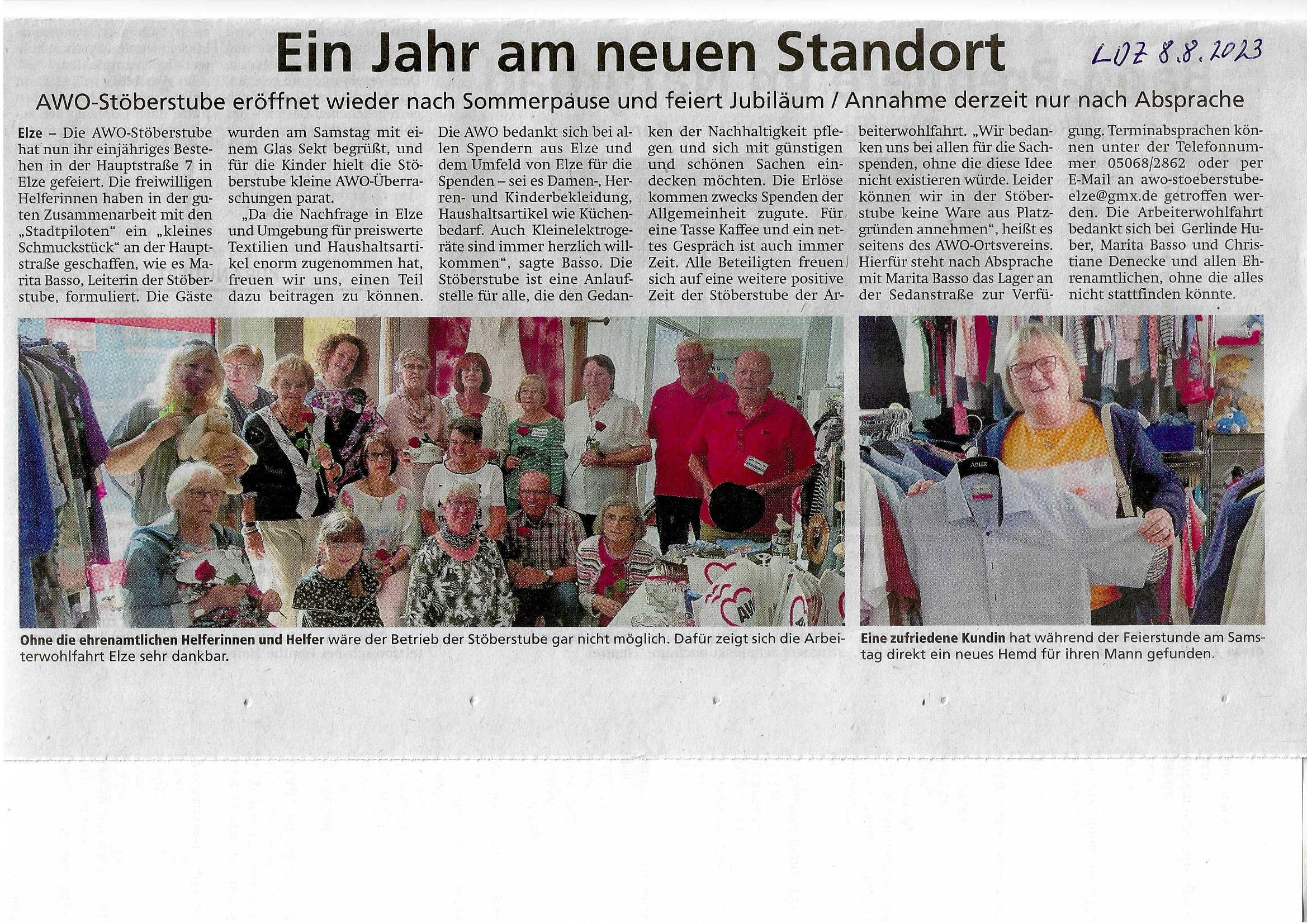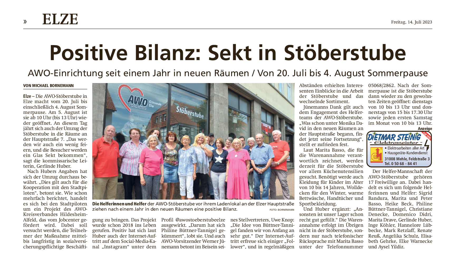 Die Stöberstube der Arbeiterwohlfahrt Elze macht Urlaub, vom 8. Juli bis einschließlich 31. Juli 2024.
