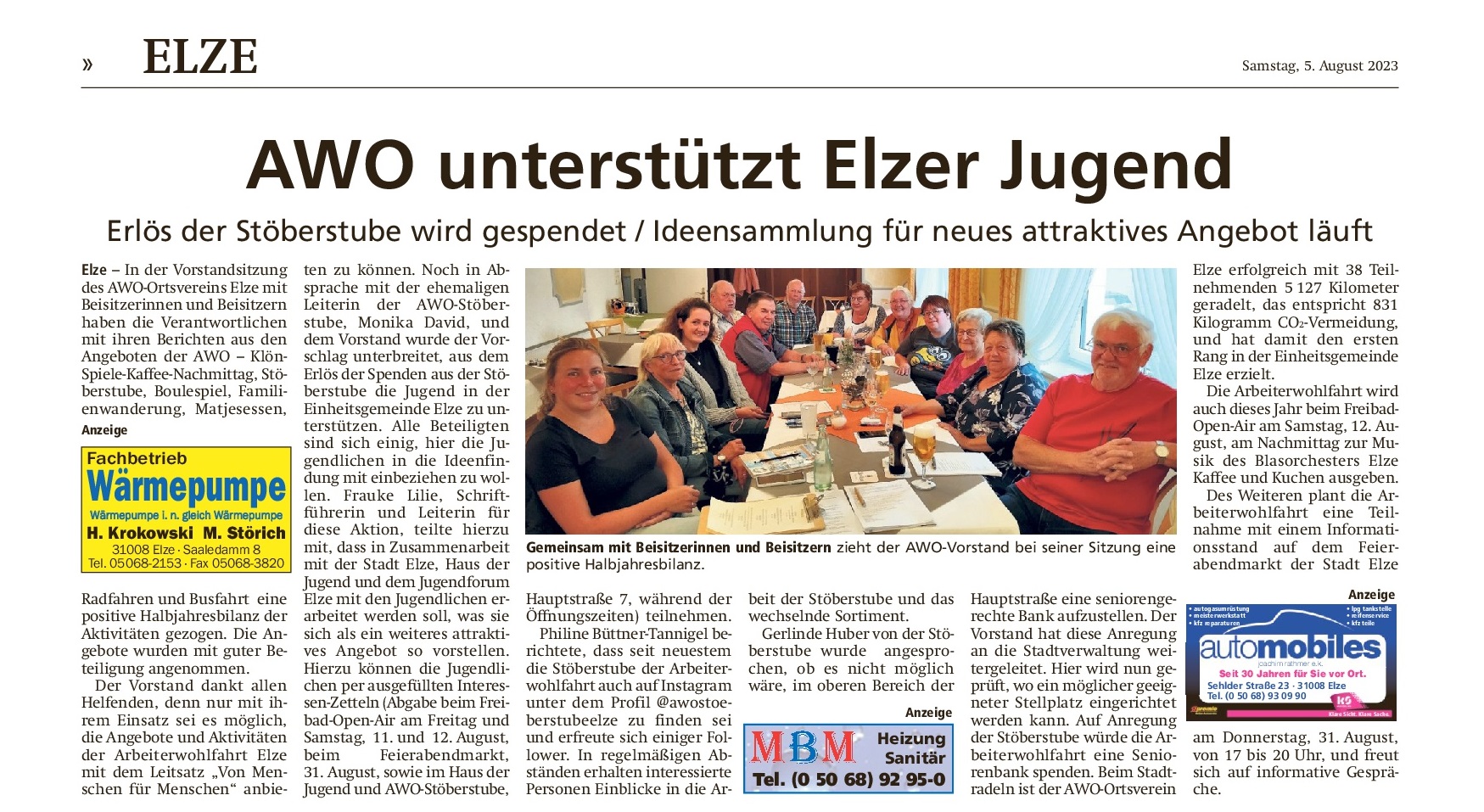 Absprachen über einen Fahrdienst können getroffen werden. Verbindliche Anmeldungen nimmt die Leiterin des AWO-Klön-Spiele-Kaffeenachmittag Anni Jünemann, bis 22.Juni unter der Telefonnummer 05068 - 3435, und 2.Vorsitzenden Uwe Knop Telefon 05068 - 3321, oder per Mail awo-elze(at)awo-hi.de entgegen.