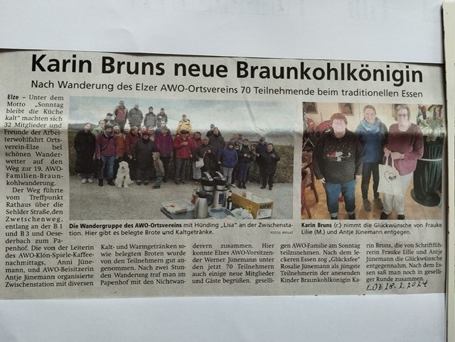 Auf geht’s zur 20. AWO-Ortsverein Elze Familien-Braunkohlwanderung. Am Samstag bleibt die Küche kalt. Unter diesem Motto treffen sich die Teilnehmer am Samstag, 22.Februar um 11 Uhr vor der Astrid-Lindgren-Schule Heilswannenweg 24. Wer nicht mitwandert, sollte um 13 Uhr in Stichwehs Hotel am Bahnhof zum Essen eintreffen. Ein Fahrdienst kann nach Anmeldung in Anspruch genommen werden. Gäste sind herzlich willkommen. Verbindliche Anmeldungen bis zum 14.Februar bei Werner Jünemann Telefon: 05068/3435 sowie per E-Mail-Adresse awo-elze(at)awo-hi.de.