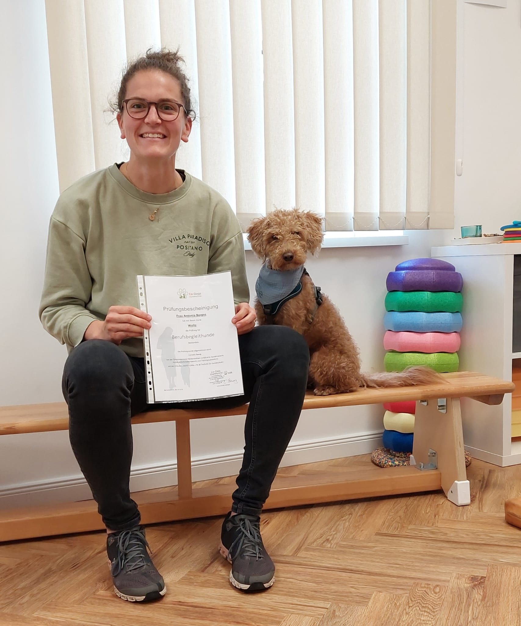 Zu mir gehört mein Berufsbegleithund „Wolle“, der uns meist drei Tage die Woche in Schellerten begleitet. Die Kinder freuen sich immer sehr, wenn Wolle uns auf Spaziergängen begleitet und mit uns liest, spielt und kuschelt.
